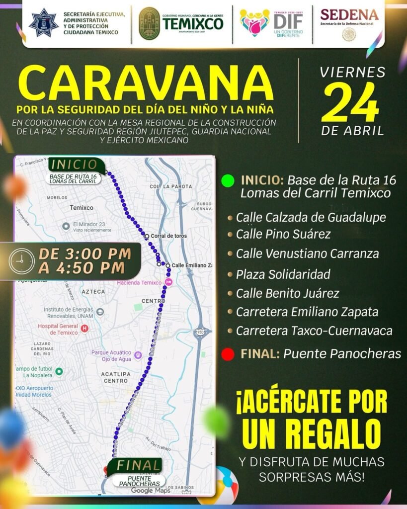 Este viernes 24 de abril te invitamos a ser parte de la Caravana por la Seguridad del Día del Niño y la Niña en Temixco.