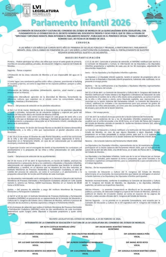 El Gobierno Municipal de Ayala a través del H. Congreso del Estado, te invitan a participar en el parlamento infantil 2026.